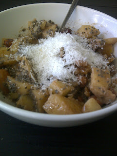 1 granny smith in stukjes snijden, aanbakken in (ruim) kokosvet en (evenzo) kaneel. Als de appeltjes lekker zacht zijn handje nootjes + paar scheuten kokosmelk er bij. Lekker laten sudderen. In een schaaltje met chiazaadjes (die het vocht van de kokosmelk opnemen en zo ontstaat er een pudding!) en wat hennepzaadjes (voor de knapperige bite) en wat kokosrasp on top :-). JAHUMM!!